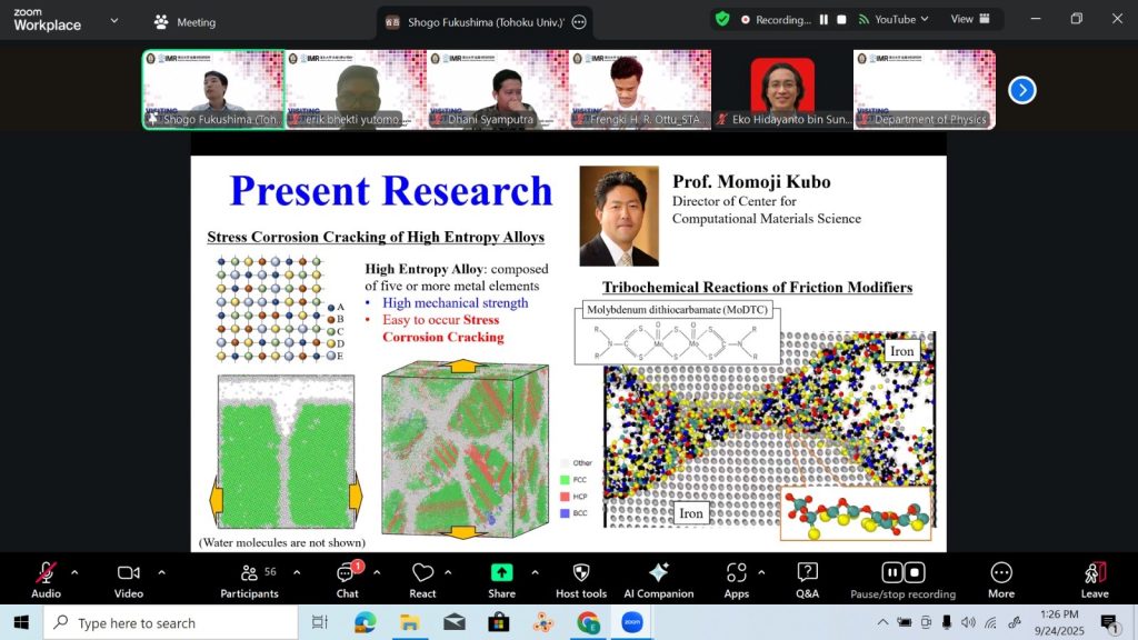 Semarang (September 24, 2025) — The Department of Physics, Faculty of Science and Mathematics, Diponegoro University held an online Visiting Professor event featuring Assist. Prof. Shogo Fukushima, Ph.D. from the Institute for Materials Research, Tohoku University, Japan.