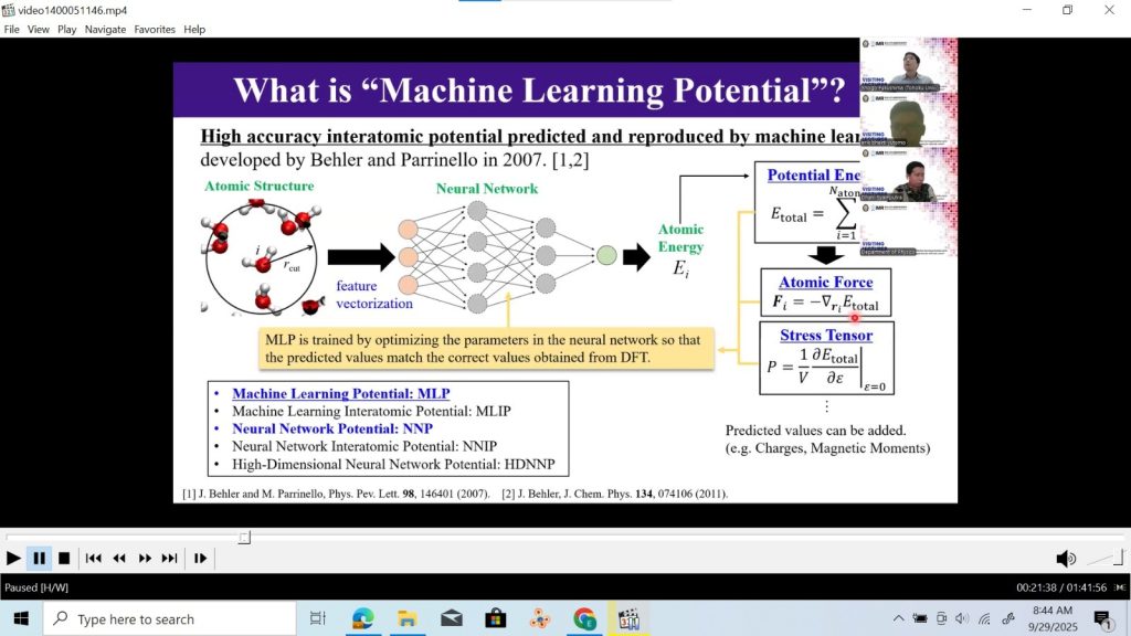 With the theme “Machine Learning Potentials and Its Application for Materials Science”, Assist. Prof. Fukushima explained that Machine Learning Potential (MLP) is an artificial intelligence–based computational method used to efficiently represent atomic interactions. This approach offers high computational speed without compromising accuracy.