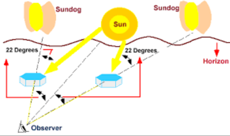 The ice crystals act like millions of small prisms. Sunlight enters one face of a crystal and is refracted (bent) by about 22°. The light exits through another face, creating bright spots on both sides of the Sun. Because this refraction angle is relatively fixed, sundogs appear at the same elevation as the Sun—about 22° to the left and/or right. They often look like two bright “suns” flanking the actual Sun.